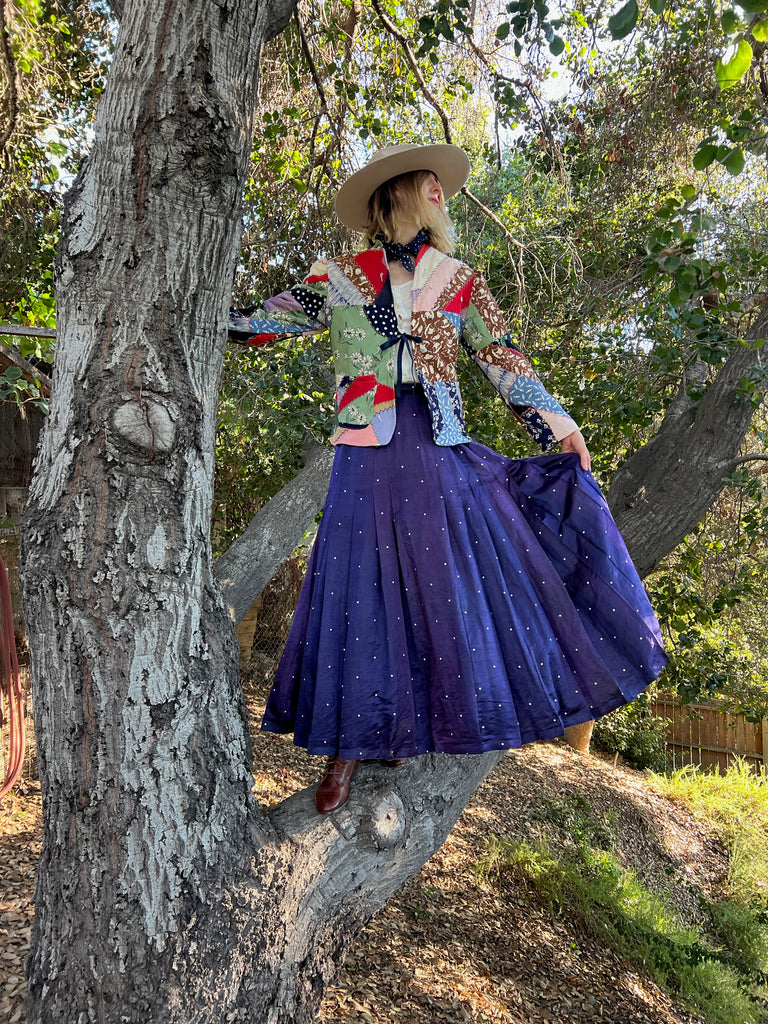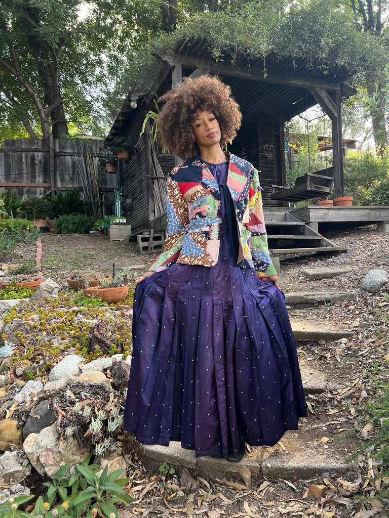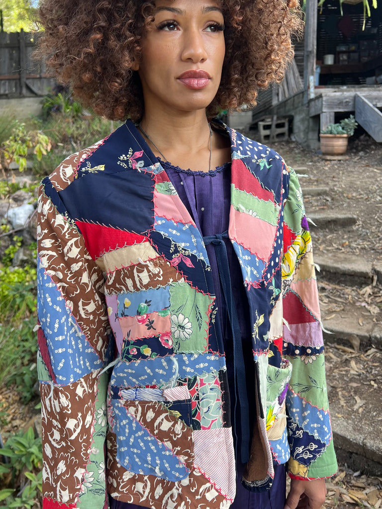 This silk patchwork heirloom quilt jacket is near and dear to our hearts. With such a beautiful mix of solid and prints, this jacket is truly unique.