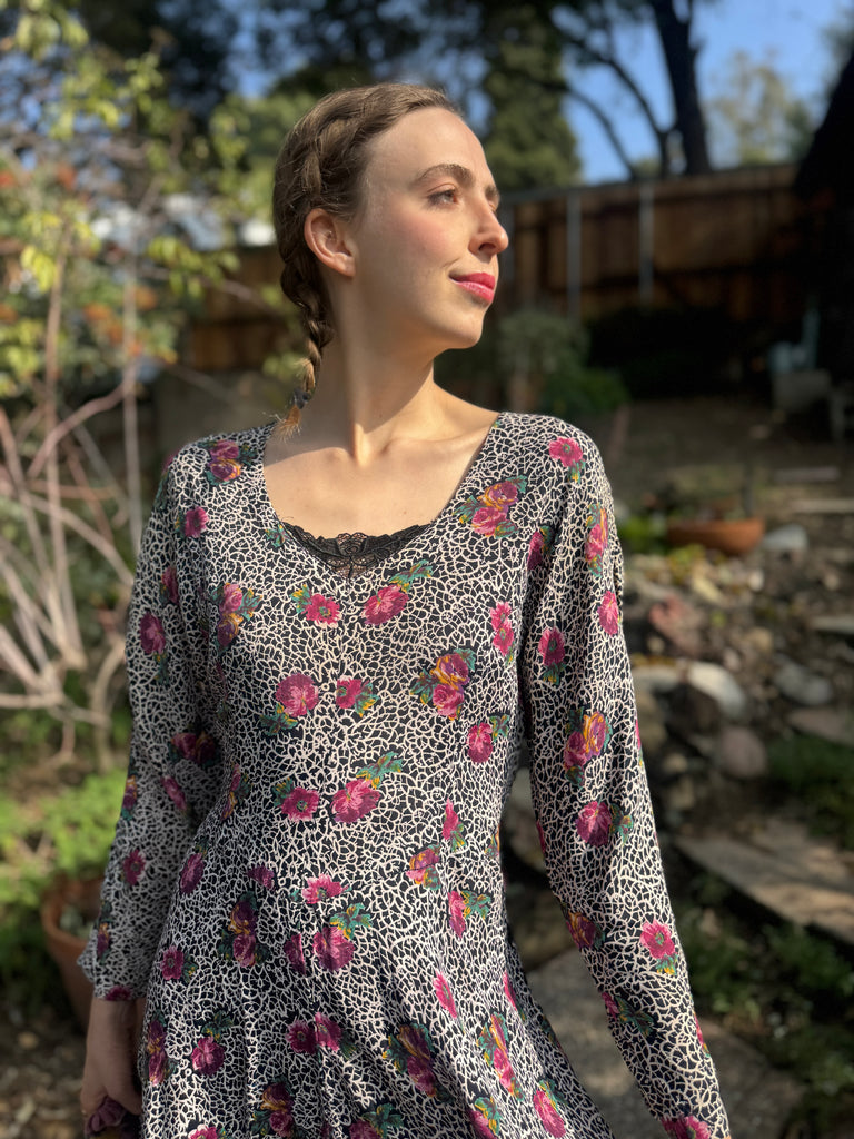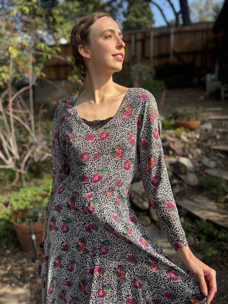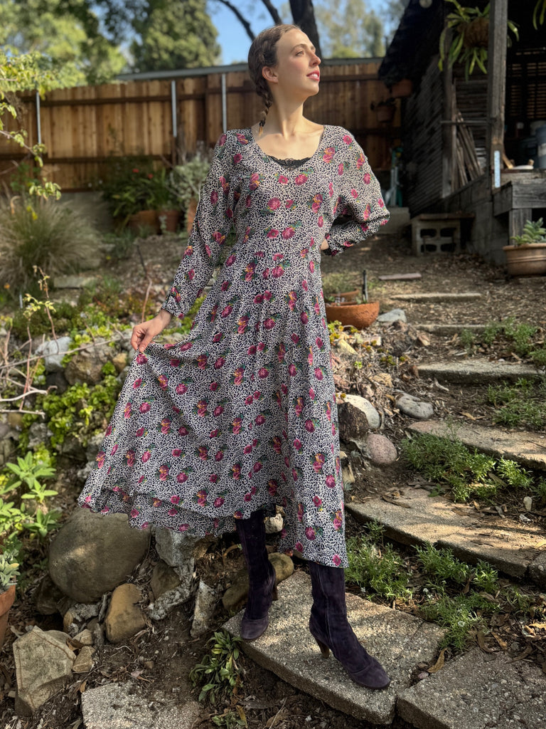 Vintage rayon floral print long sleeve midi dress with side buttons. This dress is so feminine and romantic. Please see measurements below: