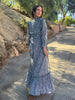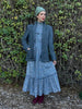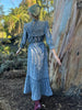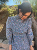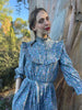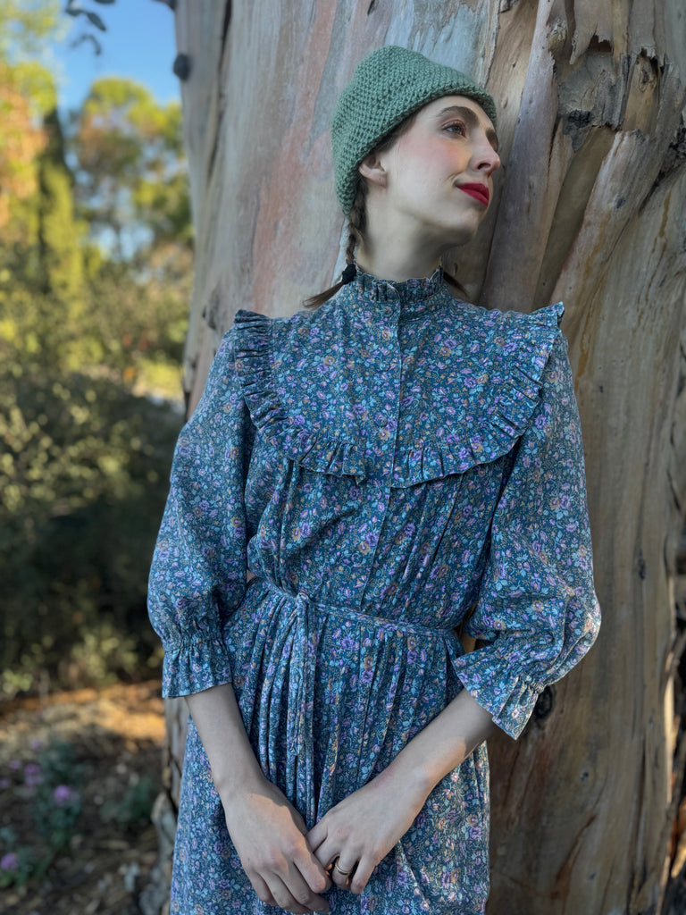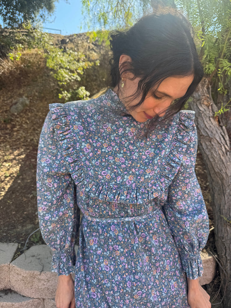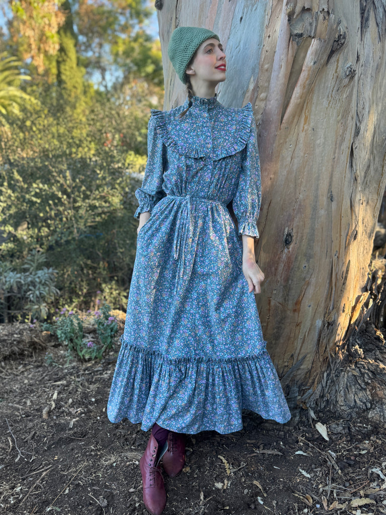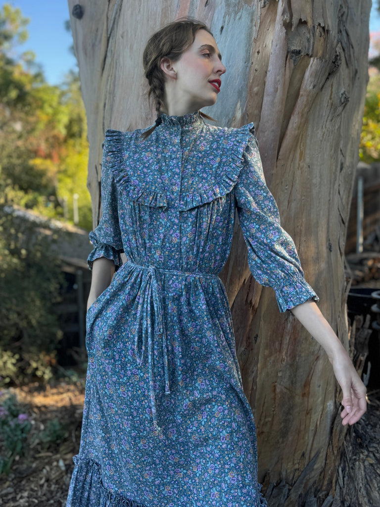 Vintage cotton calico floral print prairie dress with a ruffle trimmed yolk, 1/2 sleeves, pockets and an adjustable tie at the waist. So feminine and sweet! Please see measurements below: