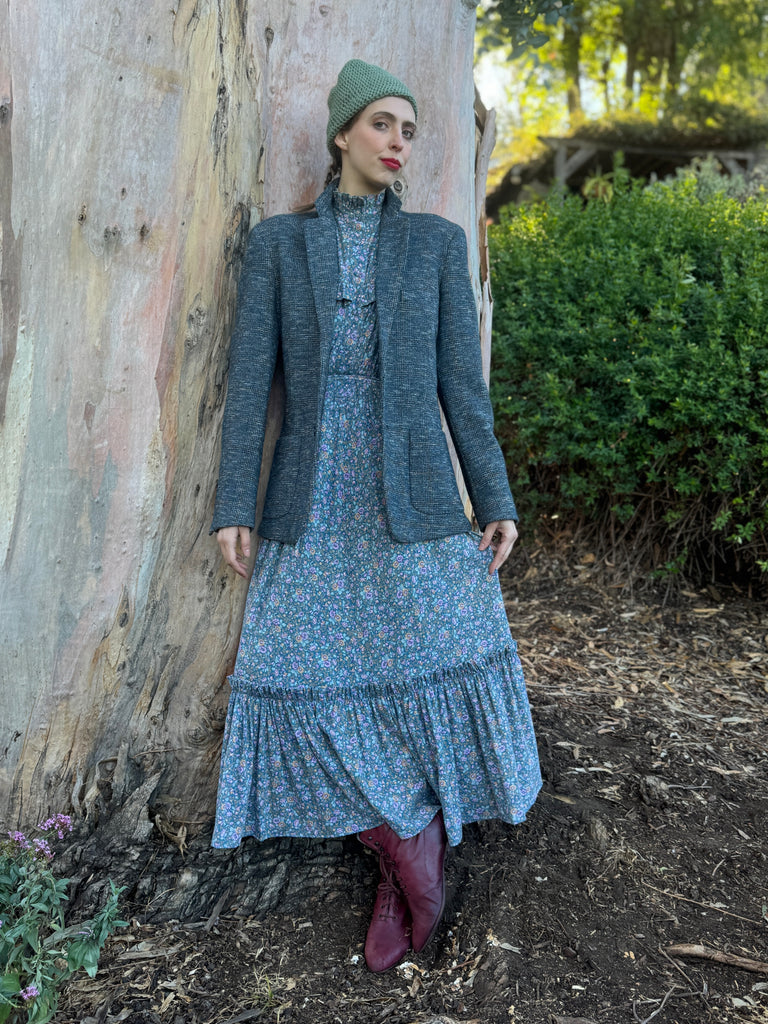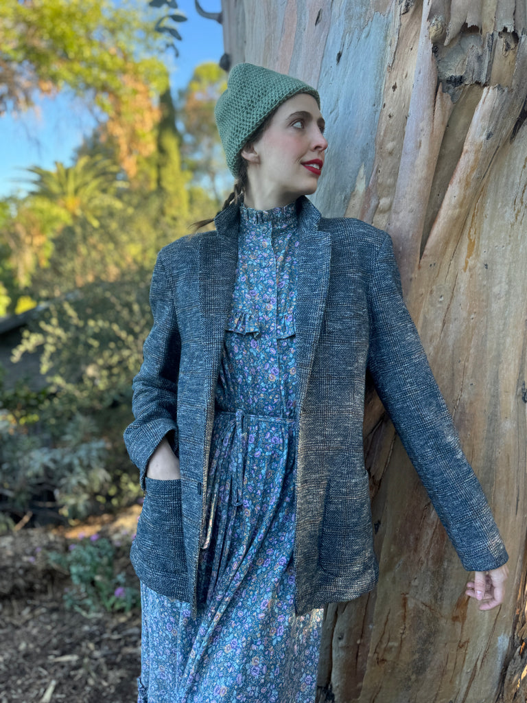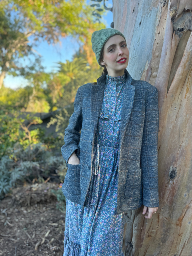 Vintage blue tweed blazer with a single button closure and front pockets. So versatile and classic! Please see measurements below: